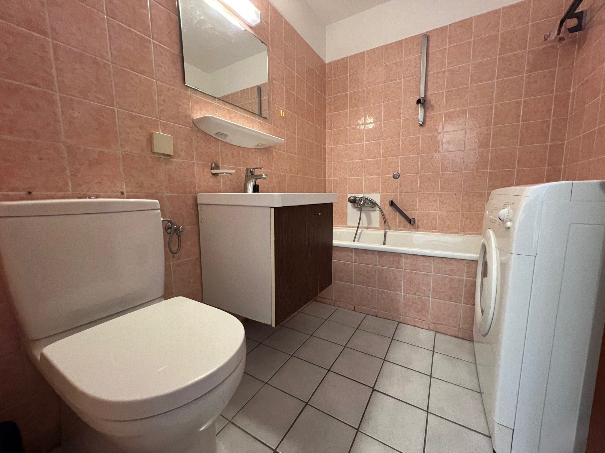 Daneben liegt das innenliegende Badezimmer, das mit einer Badewanne, einem Waschtisch mit Unterschrank, einem WC und einer Waschmaschine ausgestattet ist.