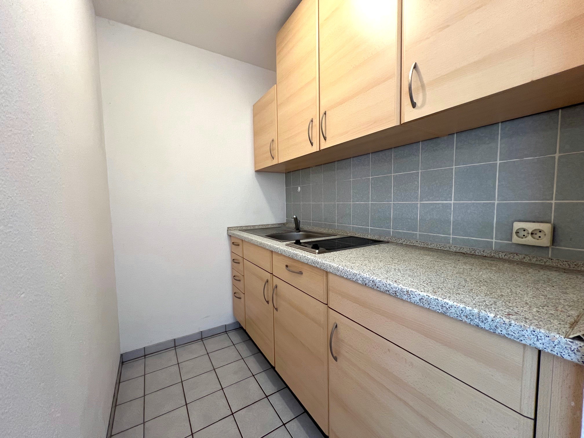 Vom Flur aus gelangt man in den quadratisch geschnittenen Wohn-Essbereich, der durch ein großes, bodentiefes Fenster mit viel Tageslicht versorgt wird. Direkt angeschlossen ist eine offene Küchennische mit Einbauküche, einem 2-Platten-Herd, Spüle sowie Ober- und Unterschränken.