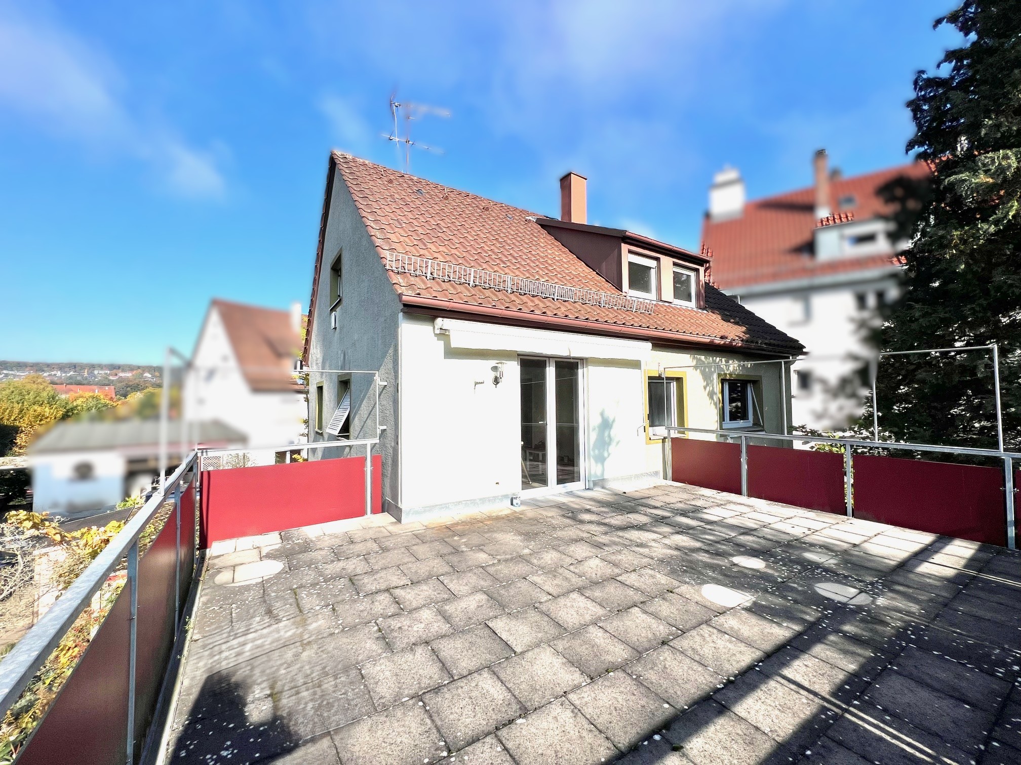 Das Haus wurde 1959 um einen Anbau im Erdgeschoss erweitert, wodurch ein großzügiger Wohnbereich mit direktem Zugang zur Terrasse und in den Garten entstanden ist und im Obergeschoss eine große Sonnenterrasse.