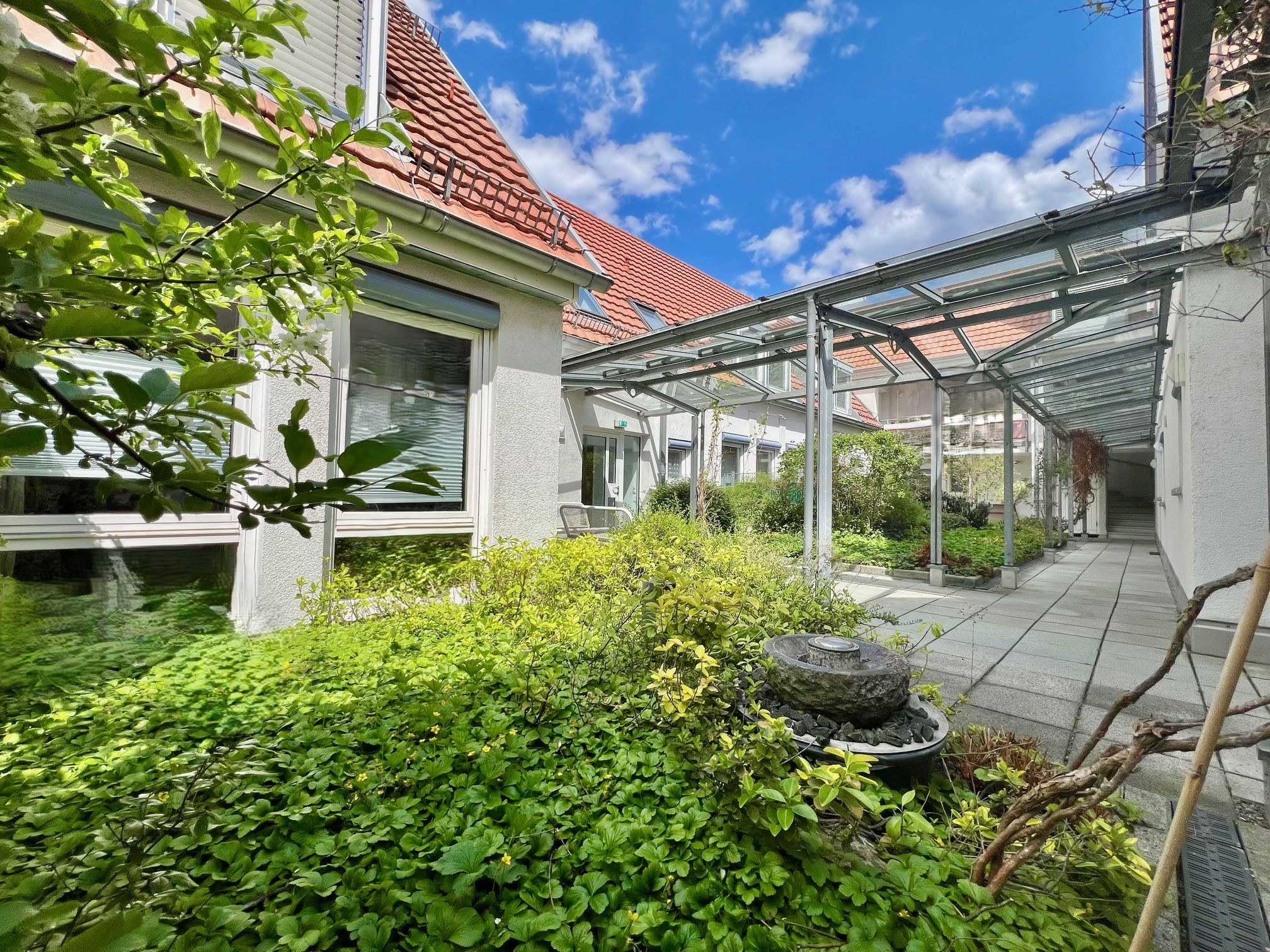 Ein echtes Highlight dieser Wohnung ist der begrünte Innenhof, der zum Entspannen und Verweilen einlädt. Besonders praktisch: Ihr eigener Wohnungseingang führt direkt über diesen idyllischen Bereich – eine seltene Kombination aus urbanem Leben und naturnaher Atmosphäre.